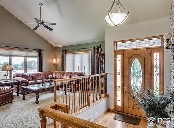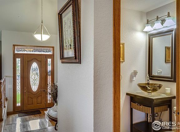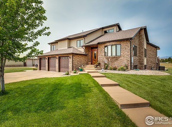 Immaculate, custom-designed home located on over 2 acres overlooking Long's Peak. Soaring ceilings &wood floors grace the main foyer accompanied by a formal living &dining room. The spacious kitchen &family room feats SS appliances, a massive island w/granite counters, floor-to-ceiling stone FP &french doors that lead to a deck &patio. Basement feats a theater, office, bath &wet bar w/wine cooler &beverage center. 2 Master Suites include 5-piece bath, jetted tub, double-sided FP &walk-in closet