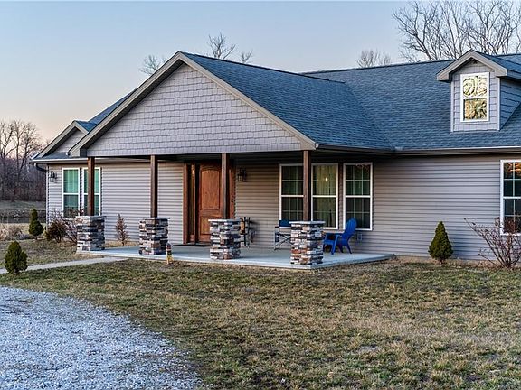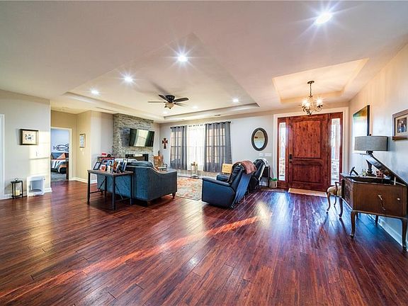 An absolute must see! This trophy property sits just outside of town on over 7 acres. Walk through the gorgeous front door to a sprawling open concept layout. Hardwood floors take you from the living room to the dining area and kitchen. State of the art kitchen with beautiful custom cabinets, farmhouse sink, granite, and a large island. Spacious living room with trayed ceiling and gorgeous stone electric fireplace. Tons of storage. The home has several bedrooms that could be used in a multitude of ways... home office, library, craft room, play room, the possibilities are endless. Other amenities include covered front and back porches, stocked ponds, safe room, oversized garage. Part of the property is in a flood plain. The home is not. Flood Cert on file. You do not want to miss this one. Schedule your private showing today!