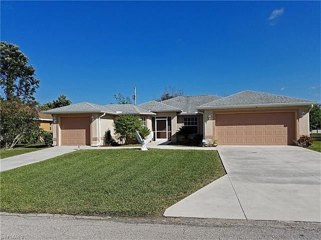 Got toys? Stuff? Need room? Here's your solution! 4 bedrooms, 3 car garage, 3 FULL bathrooms, separate storage utility room and a HUGE, under truss lanai! The living room features a high vaulted ceiling and looks onto the lanai & backyard. Master bed/bath has dual sinks, walk-in closet, floor to ceiling tiled shower & access to lanai via slider. Two guest bedrooms are large with one offering a queen size Murphy bed system which includes tons of storage & a desk! Smaller bedroom is ideal for a Den/Library. Guest bathroom has higher vanity & tiled shower. There is an air conditioned, full size bathroom that is part of the lanai-perfect to use when entertaining outside or if you add a pool. Check out the 113 sq. ft. storage room on the side of the house-store your lawn equipment! The lanai is 14ft deep and 38 ft. wide at rear. Excellent location off of Del Prado Blvd - easy access to the Mid-Point & Cape Coral Bridges, retail, doctor's offices, etc. Home is not located in a high risk flood zone either-no flood insurance required. Seller will consider financing. Furniture is for sale outside of house purchase contract. No excuses - so now you and your toys could have a new home!