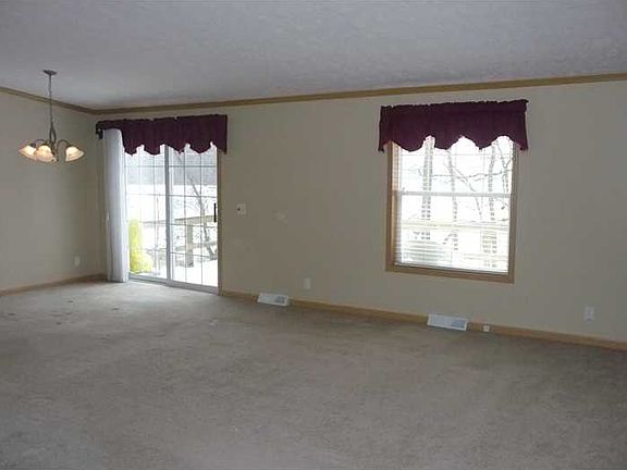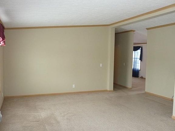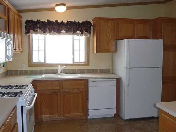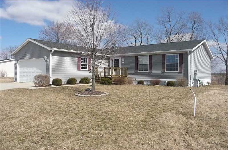 Enjoy easy living in this ranch-style home where the yard work and snow removal are taken care of for you! Relax on the back deck, overlooking a tree line and farm fields. Inside, the open floorplan flows well and is great for entertaining friends or relaxing quietly. Bonus room at the front could be used as a separate living room, home office or hobby room. All appliances stay, including washer and dryer! The land is leased, but the home is yours!