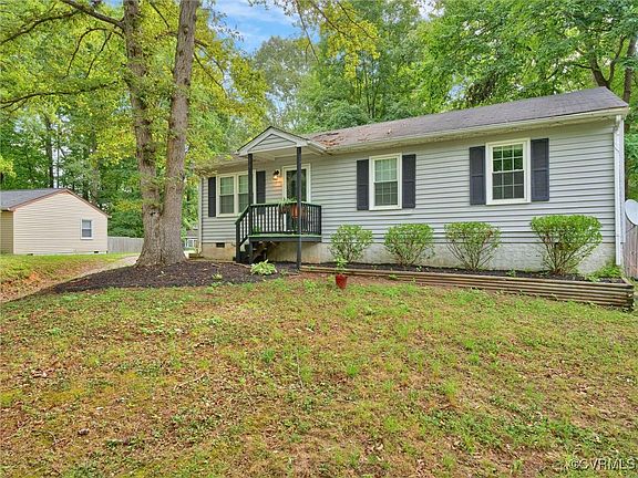 Welcome home to this adorable 3 bedroom ranch in the heart of Midlothian! This home is move in ready and offers a living room area with double window and fresh carpet. The large kitchen features wood laminate flooring, white cabinets, stainless steal appliances, plenty of space for an eat in area, extra storage and opens up to the large deck out back. The primary bedroom is spacious, has a half bathroom attached and double closet with built ins. The other two bedrooms are carpeted with closets and share a bathroom in the hallway. Other features of this property are the detached shed with electricity, fully fenced in backyard, large freshly painted deck and NEW HVAC! Schedule your showing today!