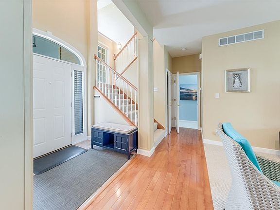 Welcome to a stunning waterfront residence that perfectly blends elegance, comfort, and functionality. This thoughtfully designed home features an open-concept floor plan, highlighted by a spacious living room with gas fireplace and large windows facing the backyard garden and pond. The formal dining room and kitchen are anchored by a large central island with a wraparound breakfast bar and integrated sink, rich cherry cabinetry, and maple hardwood floors. The first floor includes a primary bedroom suite--with dual walk-in closets and a spacious bathroom featuring dual vanities and separate shower and soaker tub-as well as a large laundry room, second bedroom, and adjacent full bath. Upstairs, you'll find three generous-sized bedrooms and the third bath. The full basement is partially finished, offering endless potential for a recreation room, playroom, or media lounge and plenty of storage space. Step outside to your private, fenced backyard and take in beautiful water and garden views from the patio. Professionally landscaped and just two blocks from the local school, this home offers a comfortable and stylish lifestyle in a truly desirable location. Updates include basement remodel (2019), new roof (2021), carpet (2021), and HVAC (2023)