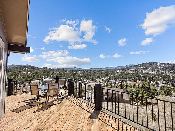 This Evergreen home is nestled in the trees on a prominent ridge providing amazing panoramic views! It's one of those locations that everyone asks me for: mountain lifestyle, super convenient to everything in North Evergreen, fast commute to Denver and DIA but in a private, low traffic, quiet spot with ridiculous views from wonderful, well maintained, wraparound decks and huge windows throughout. Gleaming hardwoods and vaulting create a light and bright atmosphere of volume and comfort. With new interior and exterior paint professionally completed, it is crisp and clean and ready to call home. Your inner chef will love the kitchen with an ideal layout, newer appliances, granite slab counters, buttery smooth maple cabinets, an under mount sink—even a built in wine rack. The twin, exposed timbers in the kitchen combine with weathered barn wood accents and beetle kill highlights throughout to create a distinctly Colorado vibe anchored by two wood burning stoves. The view from the sink will help you love doing the dishes. ;-) The main floor primary suite is oversized and convenient to a secondary bedroom currently used as a bright home office. The lower level boasts two more secondary bedrooms, the laundry room, and the second, huge family room- a rustic getaway, perfect for a theatre room or gaming area. It’s the perfect place to kickback in front of the wood stove! Outside, the adventure continues with a lower-level deck ideal for stargazing from the bubbling hot tub. The attached two-car garage provides ample storage, complemented by a sizable storage shed for all your outdoor gear and toys. And let's not forget the well-maintained yard, complete with a charming stone stairway to the mailbox and a sturdy chicken coop, inviting wholesome experiences amidst the natural splendor. Embrace the essence of Evergreen living in this remarkable home—a sanctuary where panoramic views, rustic charm, and modern comforts converge to create a haven you'll be proud to call home.