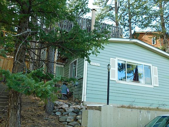 Cozy North Evergreen home on a wooded, hillside lot with views from a small rooftop deck. An east-side deck, combined with a pond feature and patio on the west, allow you to follow the sun over the course of a summer's day. The main floor features a carpeted living room and ceramic-tiled kitchen, with the main bedroom just off the kitchen. The side porch leads to both the rooftop deck and to the deck on the east side of the property. From the living room, follow the spiral staircase to the lower level French doors opening to a second bedroom or a den/office, as it is currently used. This space has a north-facing picture window, a small woodstove in the corner and wall-mounted bookshelves. Also downstairs is the utility room with washer/dryer and an efficient gas-fired boiler, as well as additional storage space. This house has loads of character and great potential in a quiet, accessible neighborhood close to Evergreen Lake and great hiking trails.