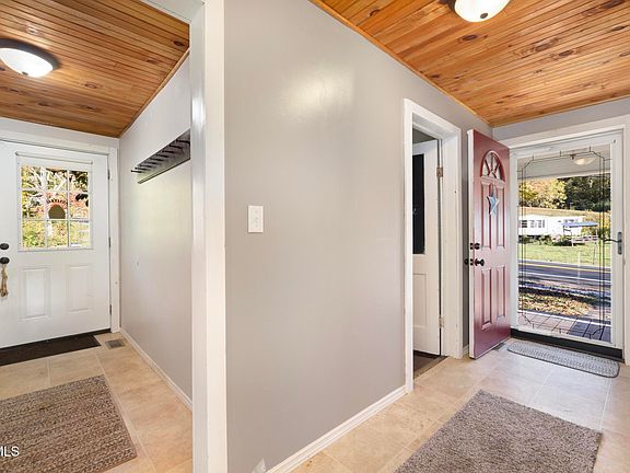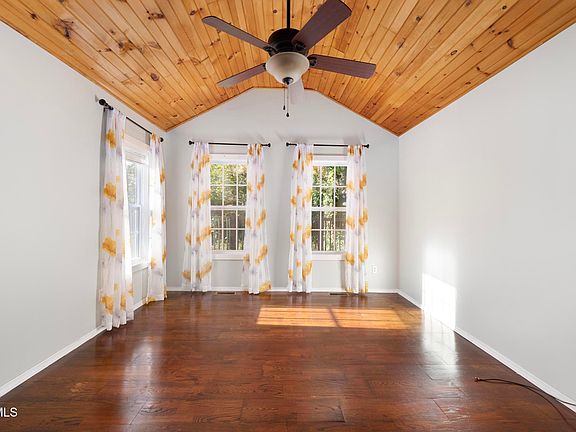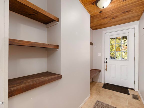 The welcoming foyer opens to a spacious Great Room with soaring cathedral wood ceilings and dual ceiling fans. Off the entry, a bonus room great for an office or potential third bedroom features original white-washed beadboard walls and ceilings. A side entry includes a mudroom with extra shelving for shoes and coat storage.