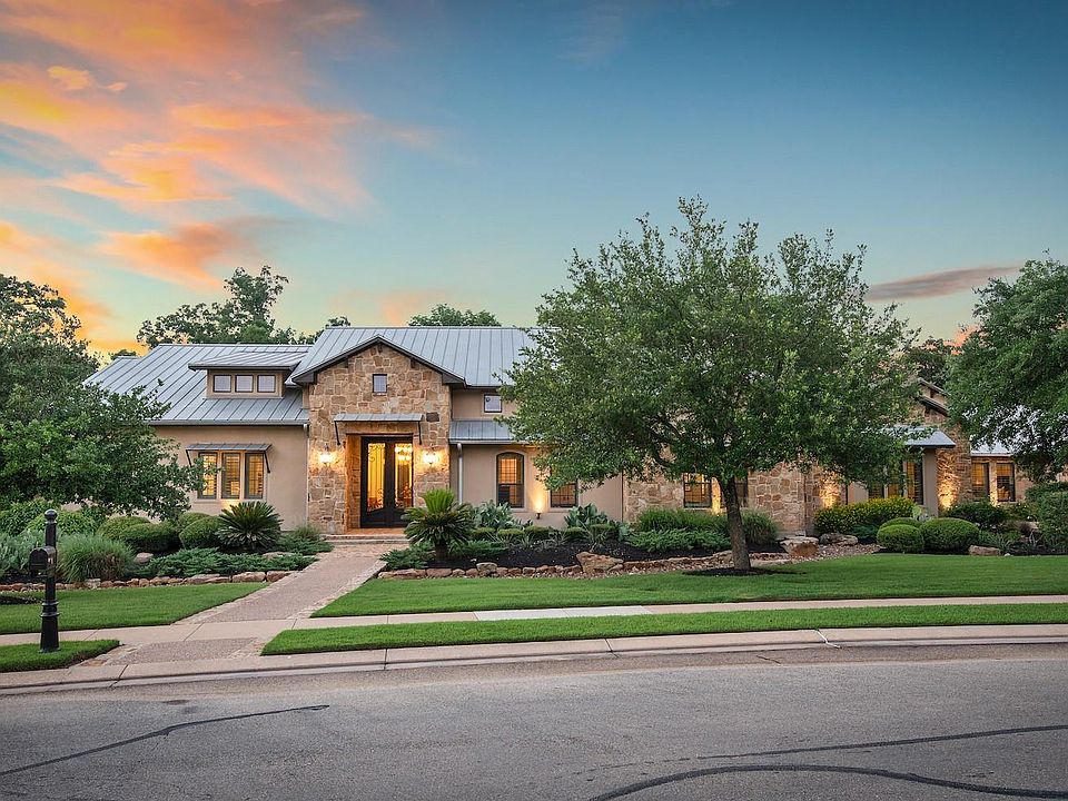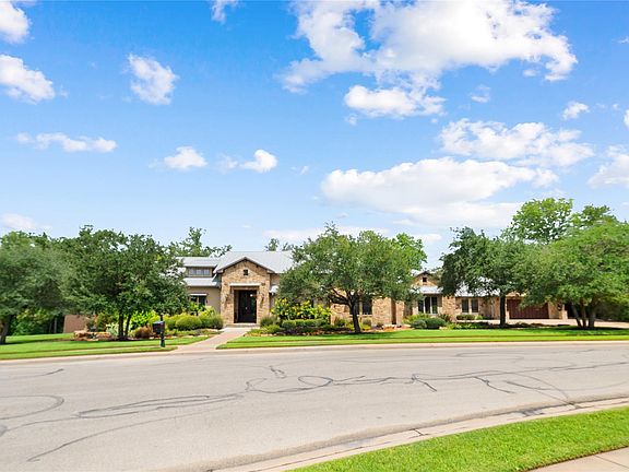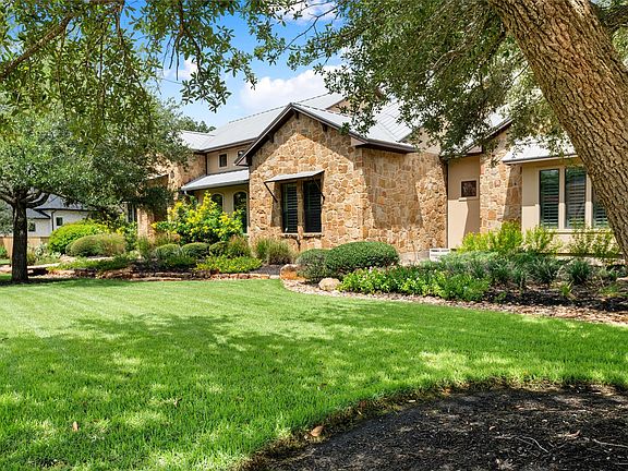 This Traditions estate situated on nearly an acre epitomizes hill country luxe. Spread out in 6,500+ sq ft of single story comfort. The formal dining room features a wall of windows to survey the resort style grounds. Living areas feature the warmth/durability of natural mesquite underfoot. Recently updated, the light, modern kitchen features a state of the art Kitchenaid appliance suite, custom cabinets, high-end quartzite, and butler’s bar. Massive fireplace bisects two large great rooms, and stately study features a 600+ bb wine cellar. The primary features a fireplace, breathtaking spa bath, and massive walkin closet. Four generous guest suites feature ensuite baths, sizeable closets. Full exercise room with kitchenette near by could easily convert to inlaws’ quarters. Stunning outdoor areas with 4,000+ sf of covered space, dining gazebo, infinity pool with waterfalls. Immaculate xeriscape/hardscape with both wooded privacy and view of three of Nicklaus’ best-designed holes.