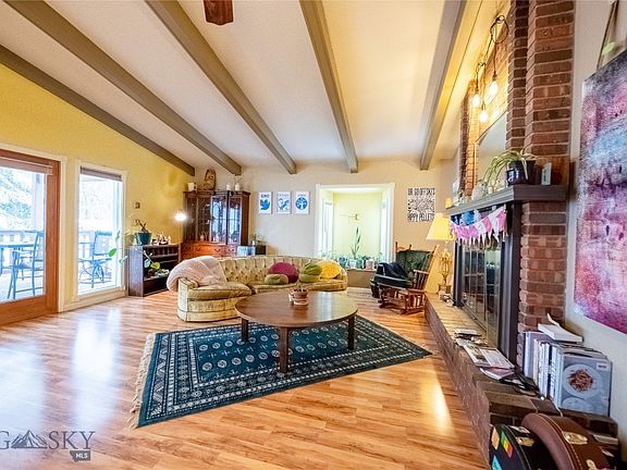 This south-side Bozeman home features a large tile entry with access to the garage. The upper level has a large updated kitchen that was completed in 2021. There are stainless steel appliances including a gas range, soft close cabinets, white quartz countertops, a butcher block eating bar, and a dining area. The living room has a brick surround wood burning fireplace, vaulted ceiling with beams, and access to the large wood covered deck. There is a large master suite with a full bath, 2 additional bedrooms, and a full bath. The daylight basement has a laundry room, family room with a wood-burning fireplace, 3/4 bath, and 2 large bedrooms. Most of the windows have been replaced. A new water heater was installed in 2017. The 2-car garage has extra storage space. There is a private well that services the underground sprinklers. The seller is leaving the shed and chicken coop.