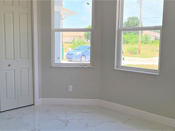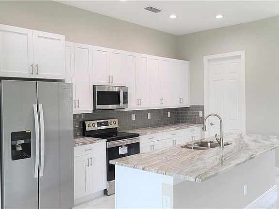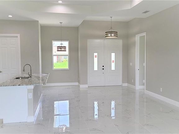 One of the most popular new construction homes in Lehigh Acres. Estimated completion by mid of Oct. 2021. Step into the double entry door, a large open living area welcomes you with modern light interior color gives you airy and roomy feel. Property boasts 9-foot ceiling throughout the house with double tray ceilings in the living room to bring it up to 11 foot. Large open style kitchen includes high level granite counter tops, soft close wood cabinets, stainless steel appliances, kitchen island and pantry. This home features a well designed split floor plan. 8-foot interior doors, 20-inch beautifully patterned large polished tiles throughout the house. Tray ceiling in the master bedroom. Master bathrooms features his and her sinks, separate garden tub, walk-in shower with polished river stone floor. Photos of another new construction home with the same floor plan.