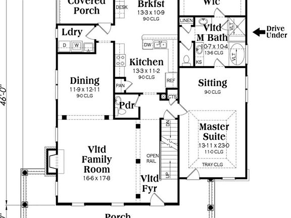 This Country house plan features a striking exterior façade complete with stunning architectural design features. The wraparound porch with column detailing, multiple roof levels, and shutter accent windows lend to a period detailing a 21st-century modern floor plan. Three bedrooms, two plus bathrooms, and a two-car garage are housed in approximately 2,300 square feet of living space. The main floor master suite occupies one side of the home and is highlighted by an enormous master bedroom with tray ceiling and an additional sitting area with side yard views. The vaulted master bathroom is elegant with a garden tub, a separate shower, separate his and her vanities, and a private toilet area. The oversized walk-in master closet sits at the rear of the space for privacy. A powder room for guests and a large utility room with a sink area complete the main floor of the home. A two-car, drive under garage is also included e 47â width also makes this an outstanding choice for a narrow lot.