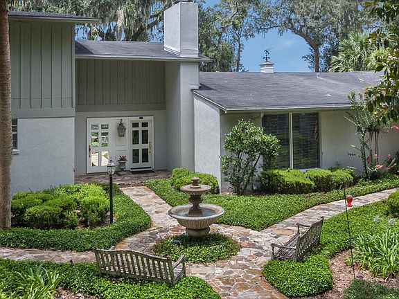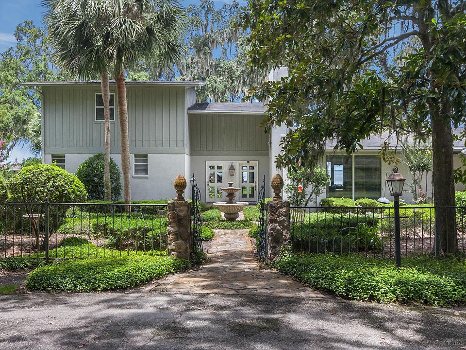 You will be wowed by the privacy & panoramic views of spectacular sunsets you will enjoy from the river-front party deck, or lanai of this one of a kind spacious home. A blend of luxury & comfortably rustic feel of this home is like no other. With 135' on the river & expansive back grounds, this home has accommodated large parties & even weddings! Enjoy boating or fishing from your own back yard surrounded by massive oaks! You approach the front door through fenced courtyard surrounding a bubbling fountain which attracts a variety of birds. The very unique floor plan features 4-bdrms, 3 of which are master suites (1-up & 2-downstairs), 4.5 bathrooms (all updated), a formal living room, huge kitchen/dining/family room combo with brick floor, massive wood ceiling beams, & stone fireplace