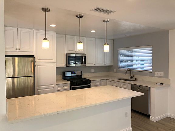 Stunning completely renovated apartment, new central A/C and heater, kitchen, appliances, marble countertops, paint, recessed lighting, flooring, bathroom tile, secured entry, with electric garage door and washer/dryer hook-up. This is an upstairs unit with large patio balcony. Located near freeways and shopping. No smoking building and no pets allowed Owner pays for water, trash and gardner