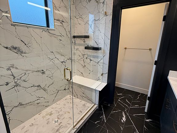 Step inside to find an open-concept living space with brand new luxury flooring, kitchen with upgraded appliances, and abundant natural light. The modern kitchen features quartz countertops, stainless steel appliances, and a large island perfect for cooking and entertaining. The spacious primary suite includes a walk-in closet, and spa-like bathroom with dual vanities and a custom glass-enclosed shower recently installed.