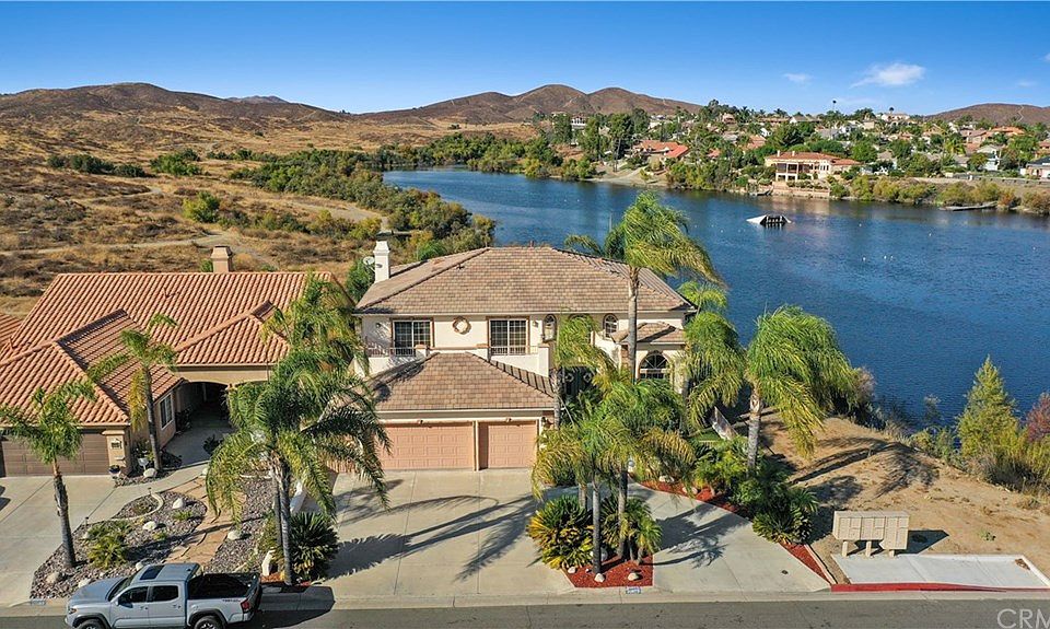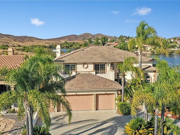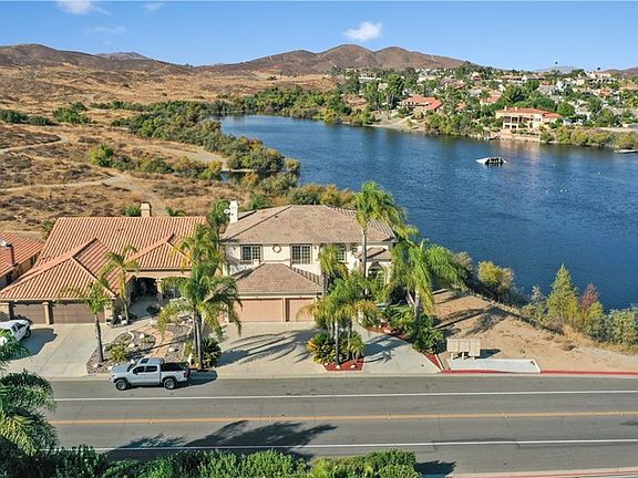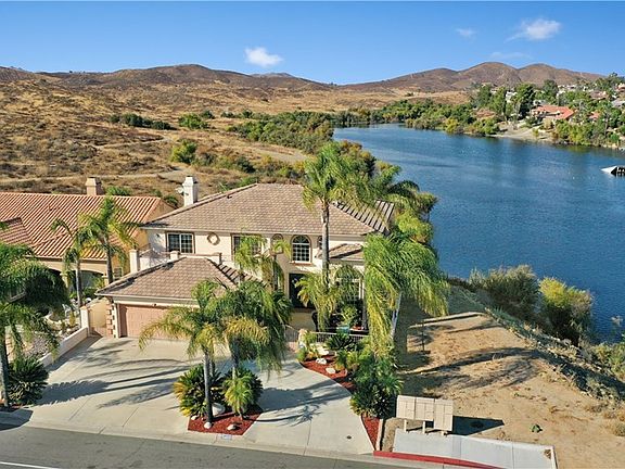 Stunning Mediterranean style home located in a very unique spot within Southern California's own private, gated waterfront community of Canyon Lake! This 4 bed, 4 bath home is situated in a manner where you have 180 degree views of the lake, backs up to open land and the Ski Jump Lagoon! Privacy, yes please! Downstairs hosts a formal living, dining and family area all well appointed with plenty of windows allowing natural light to pour in. The kitchen boasts maple hardwood cabinets, granite counters and views of the surrounding hills and lake. One bed and ¾ bath are located downstairs as well. Heading upstairs each of the two remaining spare rooms host their own bathrooms and one has a slider with access to a deck off the front of the home. The master is unsurpassed as you walk in you can't help but draw your eye to the expansive views of the surrounding hills, jump lagoon and even main lake! Laundry is a breeze as it's located upstairs within it's own room with a sink & plenty of storage. Do you have toys? No problem as the 4 car garage has plenty of room! Another unique feature is most of the major appliances have been plumbed with propane! Canyon Lake is one of a kind in that it offers a 384 acre ski lake, fishing, equestrian center, 18 hole golf course, slalom course, jump lagoon, pools, parks, beaches, playgrounds, basketball courts, tennis and pickleball courts, golf cart friendly streets, 20 miles of horse and biking trails, community events and so much more!!!