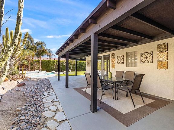 A marriage of great architecture + effortless indoor-outdoor living. Exceptional property for the price! Walled, hedged + gated. A covered patio runs the length of this Southwest-inspired home's backside. Landscape work is top notch. Pool + spa w/ waterfall delivers rather nicely. 3BD, 2.5BA and 1,412 SF. Each bedroom enjoys direct patio access via double French doors. Floor to ceiling built-ins, beamed ceilings, and fireplace work their MAGIC in the living room. Dining room opens beautifully to the patio. And the modern kitchen feels like a destination with modern finishes and breakfast bar. So much to LOVE about this special home including a gated front patio with pergola and mountain views. Curb appeal is another plus with the tall Palo Verde tree and mature cacti perfectly placed in this beautiful front yard. The Upper Outpost neighborhood of Cathedral City enjoys easy access to Palm Springs and I-10. Leased rooftop solar in place. Laundry located in the garage. Worth a closer look!