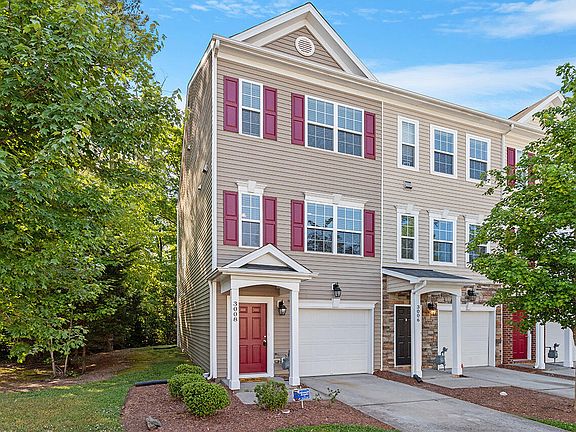 Welcome to this updated END UNIT townhome in an ideal Durham location! The brand new paint, carpet, and LVP flooring provide a modern feel right from the start. The well-designed layout, with the main living areas on the 2nd floor, provides great flow for easy living and entertaining. The light and bright kitchen features granite countertops, SS appliances, center island, and ample cabinet space. Enjoy your meals in the dining area or the convenient breakfast nook. The living room, complete with a fireplace and double doors to the deck, offers a comfortable place to relax. Thanks to the wooded lot, you have plenty of privacy. The 3rd floor features two large bedrooms with attached bathrooms. The primary suite bathroom includes dual vanities. The lower level bonus room, with double doors leading to the patio, is a versatile space. The half bathroom provides additional convenience. Refrigerator, washer, dryer included. Less than 10 minutes to RTP, and 15 minutes to RDU and Duke Univ.