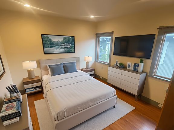 Two bedrooms sit alongside a custom modern bathroom with updated fixtures and finishes.