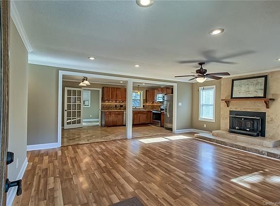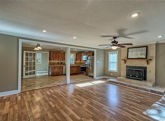 The perfect location for the Buyer who Enjoys Privacy, Loves Nature, likes to Garden, or raise pets, yet want to be close to services! The long Gravel Driveway leads you to a Ranch Home nestled among the Trees. The home boasts of a generous sized eat in kitchen w/ Stainless Steel Appliances, New Oven, Granite Cntrs, Under counter lighting & Refrigerator! The Open Plan leads into the Great Room w/ Travertine Fireplace/wood burning stove. Most rooms, Plus Bedrooms, have Laminate Hardwood Flooring & Fans! Washer & Dryer to remain! Full tiled walls in Bathrooms! Decorative Mirrors and Dual Vanities in Both baths! Fenced yard! Shed for Storage! Crown Molding. Roof replaced 2011. Best of all, NO HOA Dues, Fees or Rules! Yard goes BEYOND the fence.