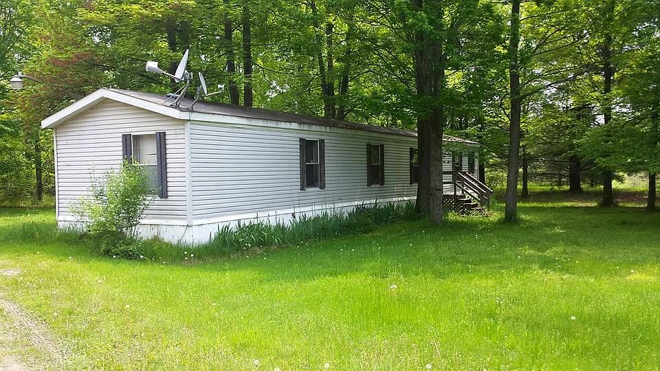 1992 3 bedroom 2 bath trailer on 1+ acres in woods. Detached 2.5 car garage with electric, insulation and concrete floor. Pole building and well house. Skirted trailer has blown in insulation on walls and trailer floor. Separate laundry room. 2018 Improvements - New carpet & pad in master bedroom 2021 Improvements - House Steel entry doors installed at front & rear entry - Rebuilt entry floor and Alcona tile installed - New toilet in master bathroom - New faucet in guest bath - New smoke detectors installed 2022 Improvements - Trees topped and dead trees cut down - Septic tank pumped 2023 Improvements - New well pump & tank - New steel roof being installed April -May