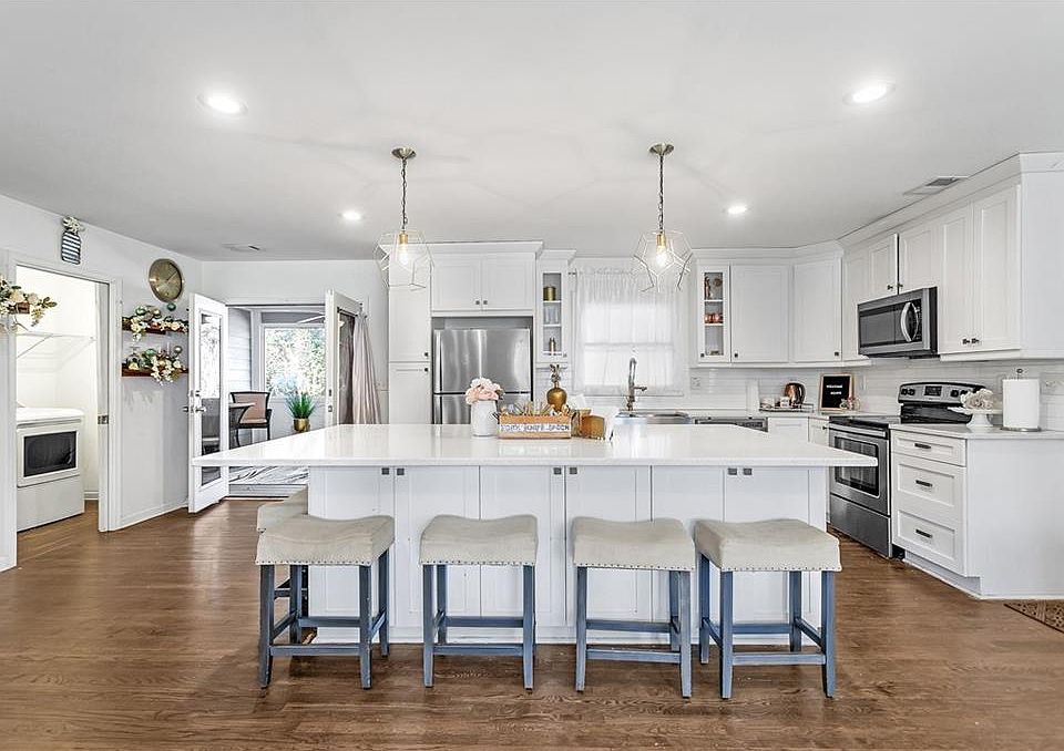 - Features: Cabinets White, Eat-in Kitchen, Kitchen Island, Solid Surface Counters