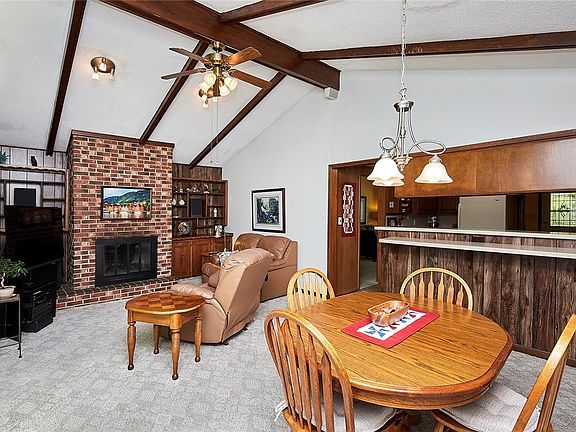 One owner home! This 3 bedroom/1.5 bath split-level home is spacious and inviting. The front living room and dining area are open and inviting with a vaulted ceiling and warm tone colors. The kitchen has been updated w/refaced cabinets and solid surface countertops. Step into the large second living room, off the kitchen, with another tall vaulted ceiling w/wood beams, generous windows, and a wood burning fireplace w/built-ins on each side. Upstairs are three bedrooms with beautiful hardwood floors and a large full bathroom. The lower level has another living room area, laundry room/storage and half bath. A deep 2 car attached garage and an exterior storage shed provide great storage options. The backyard is well manicured and private with green space beyond the property line. Home is just a couple doors down from Grandview Golf Course. Roof is new in 2022. Windows and siding have been replaced over time. This beautiful home has been well maintained and updated and is ready for you!