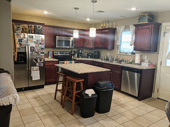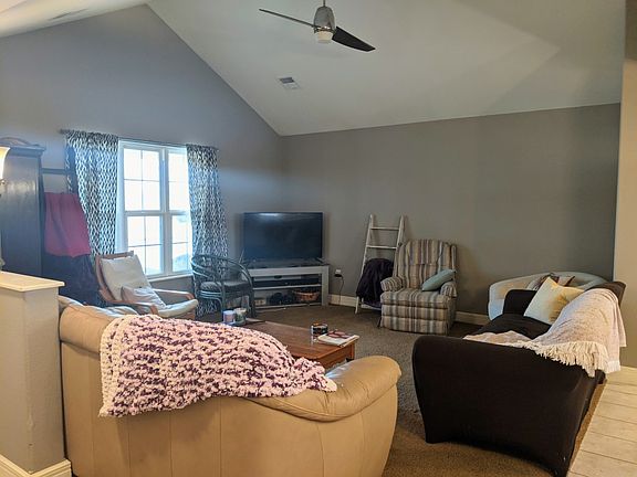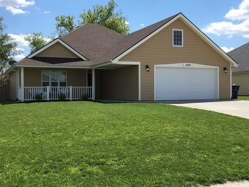 Terrific 4 bedroom, 2 bathroom home in Manhattan. This home has a covered front porch, an open floor plan with a spacious living room that has vaulted ceilings, a dining area that walks out to the covered back patio, and a kitchen with an island that is perfect for cooking and entertaining. The huge master bedroom has a private master bathroom with double sinks and a soaker tub with a tiled shower. The roomy master closet doubles as a safe room. Two more bedrooms, the second full bathroom, and laundry room finish off the main floor. Upstairs is the fourth bedroom. The backyard is fully fenced and has plenty of space for pets and fun.