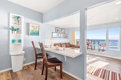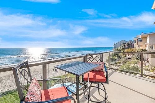 This charming 1-bedroom, 1-bath condo is fully furnished with breathtaking views of the Pacific Ocean through its glass doors. Enjoy the soothing sounds of waves, stunning sunsets, and ocean fun just steps from your door. The home features two flat-screen TVs, free WiFi, and a fully stocked kitchen for cooking or barbecuing. Located directly on the sand in prime Carlsbad, you'll be near the area's best shops, restaurants, and attractions. Carlsbad offers perfect weather year-round, and the property is minutes from Legoland, top beaches, and fine dining. It's also a short drive to the Four Seasons Aviara Golf Course, La Costa Resort, SeaWorld, and San Diego's famous zoo. Disneyland and Knott's Berry Farm are also within reach.