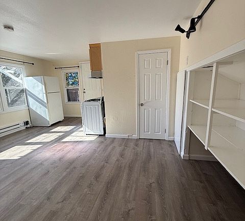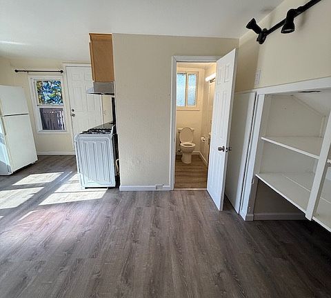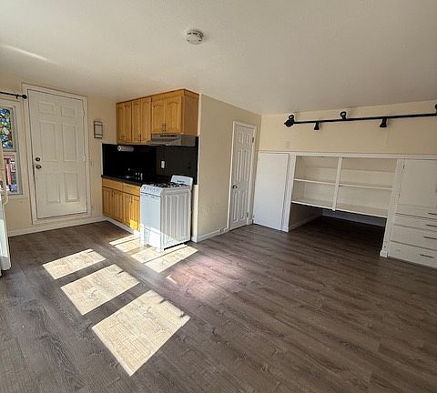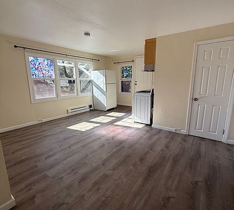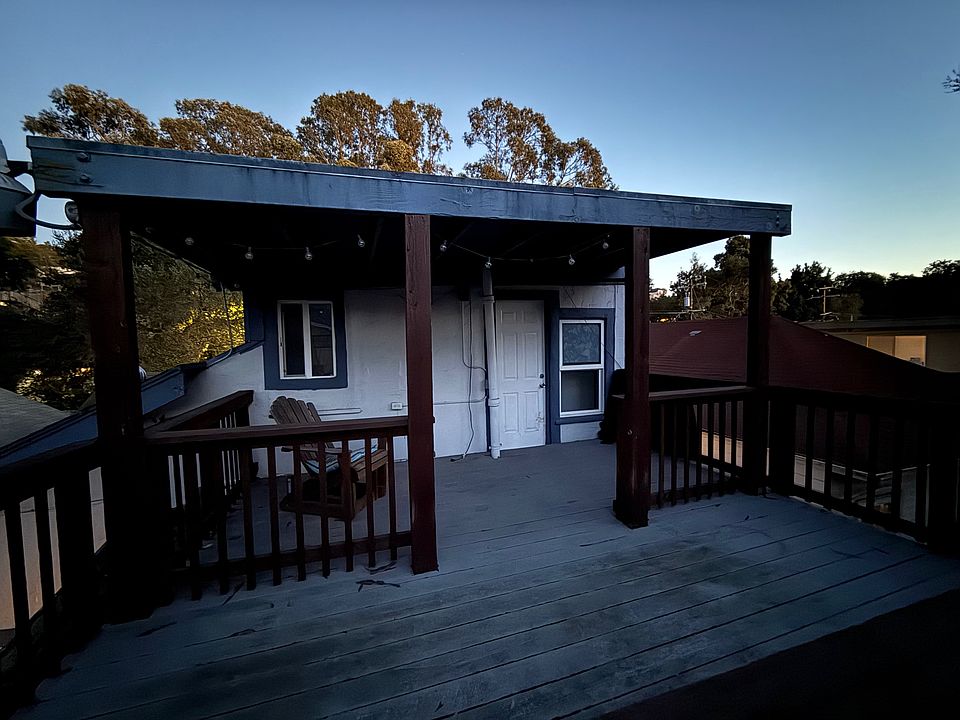 Remodeled Unique Upstairs Studio with Large Private Outdoor Deck in Renovated Vintage Fourplex near Piedmont Avenue: The studio is situated along Glen Echo Creek in a small greenbelt area with a creek and pocket park: easy walking distance to Piedmont Avenue shops and restaurants; Sprouts, Grocery Outlet, and other shops and restaurants on Broadway; near BART and public transportation. Convenient & close to 80, 580, 980/880, and 24 freeways. A few minutes to Downtown Oakland; 15 minutes to San Francisco by Bay Bridge. The studio is the back, upstairs unit in a 1.5 story Renovated Victorian fourplex house, built 1907, set in a quiet garden setting with a locked entrance gate to the grounds. Parking is on the street. The Remodeled Upstairs Studio features the following: The studio itself is ~400sq. ft. but is unique in that it has a large, ~300sq. ft., attached, private wood deck that is 1/2 roofed and 1/2 direct sun which allows for a very expansive indoor/outdoor living experience for a studio, rain or shine, with ample room to have outdoor furniture, outdoor lights, plants, etc. amidst the surrounding trees. The main room has large windows and is very bright The remodeled kitchen has ample cabinet space, a granite countertop, full-size sink, full size refrigerator and a gas stove. The remodeled bathroom has a full size bathtub and shower There is a good amount of built-in storage space and recessed bookshelves, as well as an extra closet in addition to the clothes closet. The studio also features a very unique large space under the recessed bookshelves that either could just be a very large, deep storage area, or, as in the past, if you have a double bed frame with wheels mounted, you could roll an entire double bed into the eaves of the house, completely clearing the floor space the bed occupies to make more flexible use of the studio space as desired. This is a good deal on a great place that will not last long on the market. Address: 3009 Richmond Blvd, Oakland, CA 94611 (Xstreet Frisbie) One year lease preferred. Tenant pays electricity/gas. Owner pays for water, sewer, and garbage. No Smoking Building and Unit