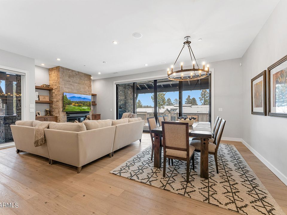 This tremendously sought-after, main level condominium is the perfect Flagstaff retreat. Upon entering the home, you are greeted by a remarkable floor to ceiling stone gas fireplace with surrounding built-in shelving, and wood flooring throughout. The large center sliders lead you to the back patio including a built-in BBQ and built-in ceiling heaters. The home features an open kitchen with Quartz countertops, island with additional seating, full tile backsplash, beverage refrigerator, and Wolf oven and 6 burner range. The tongue and groove ceiling and a custom bar area with microwave finish out the kitchen space.