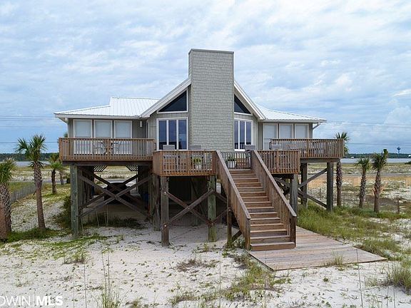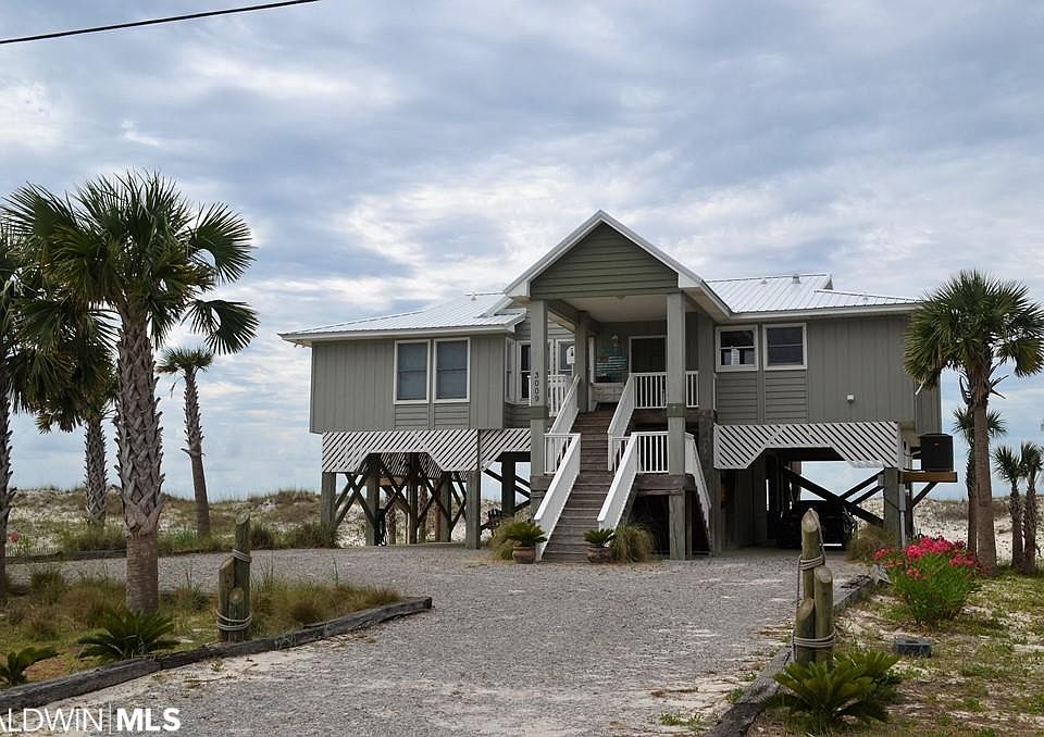 Gorgeous 100' gulf front location near the west end of Beach Blvd. High sand dune elevation, beautiful views of the shoreline plus unobstructed north views across to Little Lagoon. Exceptionally well maintained home with brand new metal roof and 2 recently replaced (Aug 2018) HVAC condensers. Nicely landscaped with irrigation well installed 2017. Open floor plan with soaring vaulted ceilings and fireplace (electric insert). Large bedrooms, each with their own private bathroom and all have pretty water views (2 are direct gulf front). Wood flooring throughout main living area is in excellent condition, granite counters in the kitchen and accent lighting in living room. Large laundry area. Recently expanded south decks with 2 access points from living room. Has never been a rental.