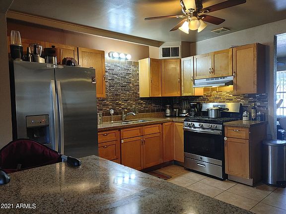 CUTE UPDATED and expanded home centered around Granite and Stainless kitchen boasting gas range and granite counters/breakfast bar! Custom tile backsplash! Tile throughout home. Welcome friends to your home with the huge, covered porch, shade trees, flower beds and low maintenance pavers in front. Lots of off-street parking, too! Beautiful low maintenance entertainer's back yard with water bill-saving turf, huge ramada, more shady trees, and large patio. Professional photos coming soon. Stated square footage does not reflect owner additions.