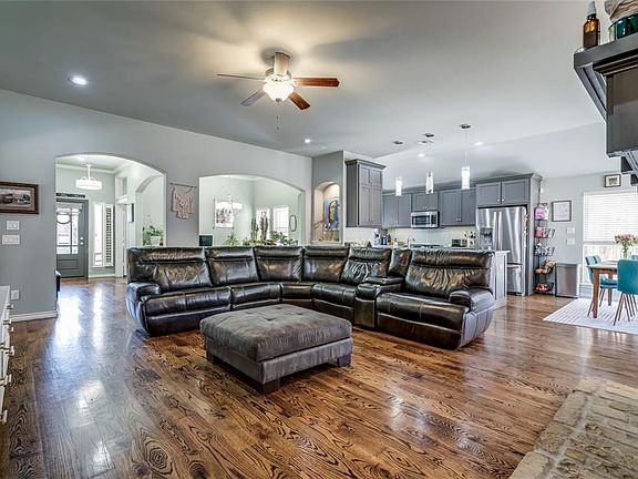 Welcome Home to this amazing home featuring an incredible open floor plan! Gorgeous Real wood floors throughout the majority of the home. Huge living area features a beautiful rock fireplace. Spacious kitchen with plenty of counter space for cooking, cabinets & drawers for storage, gas stove, pantry and a large island with breakfast bar and breakfast area. Formal dining room for plenty of seating for family and entertaining. Home features 3 Bedrooms 2 Bathrooms, Study with incredible built-in desk, cabinets and shelving. Second living area or optional 4th bedroom. Amazing Primary suite with beautiful on-suite bathroom, walk-in shower, whirlpool tub and walk-in closet with built-in chest. Spacious 3 car garage with storm shelter. Wonderful backyard with incredible patio and built-in grill area with bar. Walking distance to the elementary school located right across the street from the home with a sidewalk path leading to the school. Neighborhood Play grounds, community pool, gorgeous ponds to enjoy. Call for your private showing today.