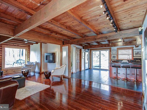 This is the home you have been waiting for! Are you tired of the cookie cutter homes and want a truly private and beautiful place to call home? This is it! Rarely does a property of such incomparable serenity, privacy and beauty become available. A long winding driveway winds up to this charming and well-constructed 4 bedroom, 2 1/2 bath Heritage Log Cabin home. Situated on almost 5 acres, this property adjoins open space and while you are only minutes from shopping, you get to enjoy the bucolic Bucks County countryside. This home offers a very large front porch perfect for watching the natural scenery and relaxing. The Architectural Grade Post & Beam structure is impressive as you enter the home into the living room and are greeted by with a wall of glass facing South for maximum winter solar gain and cozy fireplace. This home has a true open floor plan and stunning attention to detail from the updated flooring to the newly updated kitchen with modern features such as new cabinets, large center island, granite counters and stainless steel appliances. The kitchen leads to a bright breakfast dining area and overlooks the large two story family room with stunning stone gas fireplace that can heat the whole house. (There is also new electric baseboards in all rooms). Upstairs you'll find a spacious Master Bedroom with library seating area. In addition two walk in closets and Master Bath. The upstairs loft adds another room to enjoy, with skylights and a great view of the Family Room below that extends views to the woodland treetops. There are also three additional bedrooms upstairs. On the first floor there is a 2 room Home Office located off the garage, with separate outside entrances to both rooms. Many Possibilities... Pride of ownership is apparent in this well maintained home. It is well insulated and energy efficient. Outside the flagstone patio gives you a private view of the garden that wdesigned to be almost maintenance free, so you can spend more time enjoying them. The home has been pre-inspected by a licensed and insured home inspector, septic inspector and water company. Excellent reports are available for buyer's review upon request. All the work is completed for you; just move in, unpack and relax! Located in Palisades Blue Ribbon School District. .. This tranquil setting could be the perfect Weekend Getaway or year round residence. 10 minutes to Lake Nockamixon. 90 minutes to NYC, easy access to Rte 78 and Rte 309. There is no sale sign - Please do not enter property without an appointment.