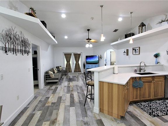 Tastefully appointed 3 bedroom, 2 bath custom home on oversized lot of almost half acre with mature Oak trees in quiet rural community of Ridge Harbor. Home offers new wood look porcelain tile, soaring vaulted ceilings, plant shelves, recessed lighting, archways, color accent walls, blinds throughout, whole house water softener system, and large fenced back yard. Kitchen boasts pendant lights, custom wood cabinetry with crown molding, new quartz counter tops, long breakfast bar, pantry, new sink, and stainless appliances including new microwave and dishwasher. Other features include dedicated laundry room with washer, dryer and utility tub, new built in buffet in dining area, and impact resistant windows. Great room has French doors that lead to screened lanai with view of beautiful newly fenced back yard. Master suite has walk in closet and wall closet, and en suite bath with Roman shower with glass block wall and custom stone finish. Updated 2nd bath has access to lanai. Front porch, 2 car garage, and carport on side for parking your boat or RV complete the package. Proximity to waterways, local beaches, dining, shopping, and golf courses makes this property ideal for the Florida lifestyle. Also, easy access to public parks with bike and walking trails and picnic areas, and boat ramps providing access to many waterways, beautiful Charlotte Harbor, and the Gulf of Mexico. And quick access to Interstate 75. This home is move in ready. Great home in a great neighborhood!