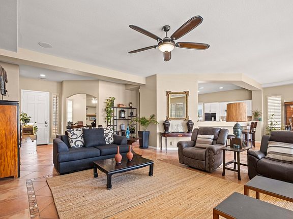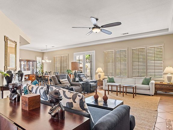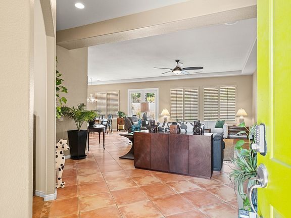 Discover a remarkable 4-bedroom, 3-bathroom home with 2,513 square feet of living space in the heart of Cathedral City. This stunning property boasts a spacious open floor plan with high ceilings, a mix of tile and carpet flooring, elegant window shutters, and ample storage space. The inviting living room features a cozy fireplace, perfect for relaxing evenings, while the formal dining room and dedicated office provide additional functionality. The gourmet kitchen is a chef's delight, equipped with granite countertops, built-in appliances, recessed lighting, and abundant cabinet space. Each bedroom is bright and airy, with ceiling fan/light fixtures, and two of the bedrooms offer en-suite bathrooms for added convenience. Make your way outside to an entertainer's paradise, complete with a sparkling pool and spa, a misting system, and plenty of privacy. The outdoor area includes a built-in BBQ, a patio with an outdoor fireplace, and space for additional seating, perfect for gatherings and relaxation. Additional features of this property include an attached 2-car garage, paid-off solar panels, and low-maintenance landscaping, making this home as efficient as it is beautiful.