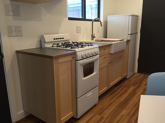 This contemporary studio unit is an awesome setup for an individual looking to live the simple life with everything you need and nothing you don't. The compact design features a full kitchen with included refrigerator/freezer and gas range, stackable washer/dryer, and full bathroom with flexible bedroom / living space that will easily accommodate a queen bed and a sofa. Included wardrobe and washer/dryer unit are in the unit. 2 off-street parking spaces off Fretz. 1 Year minimum lease term. Not suitable for dogs (no fenced yard). 1 cat allowed - $35/mo additional.