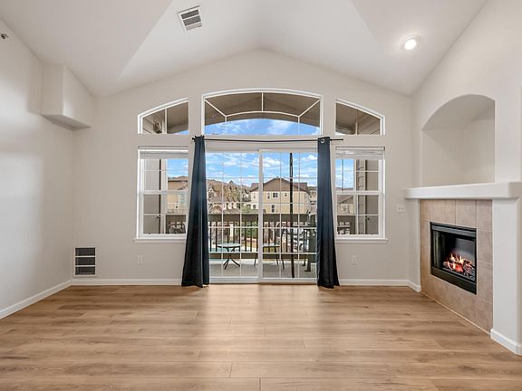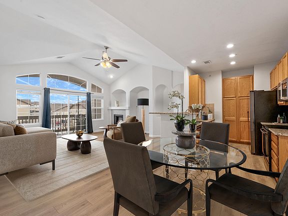 Stunning penthouse corner unit with breathtaking views of the pool and the iconic Castle Rock (known simply as "the Rock"). This spacious living space is bathed in natural light, thanks to its abundance of windows. You'll find ample cabinet space, including a convenient wall pantry, along with newer appliances. The great room boasts soaring ceilings and an electric fireplace, opening up to a balcony with added storage. Fresh, new wood flooring spans the entire unit. The primary bedroom is generously sized and enjoys the comfort of a lighted ceiling fan, a walk-in closet, and an ensuite bathroom with a bath/shower combination. The second bedroom is spacious and comes with a dedicated alcove for a desk. In-unit laundry is a practical convenience, complete with a new washer and dryer. The full bathroom is the unit common bathroom and/or private bathroom for guest bedroom There are several places to park in parking lot. You can take advantage of the outdoor pool for relaxation. The location is ideal, with proximity to town, parks, fairgrounds, and a dog park Lease term is one year minimum. No smoking. Parking is first come first serve and is uncovered. Pets can be considered.