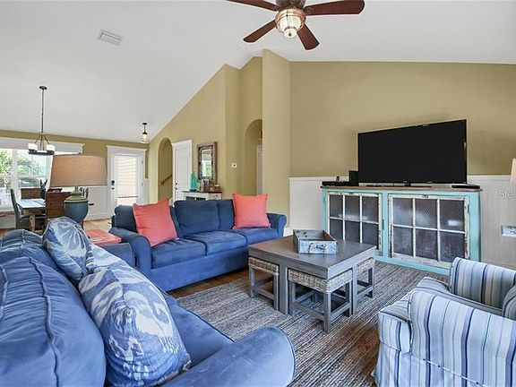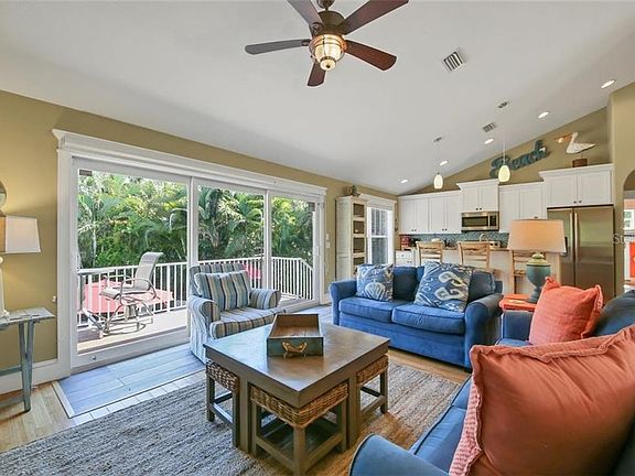 Island Paradise Awaits! This impeccably designed 5 bed/3 bath coastal treasure is a perfect beach house, only a short stroll to the beautiful turquoise Gulf waters, and sitting on a large corner lot on a quiet street! The open floor plan lets in all the Florida sunshine, while giving everyone their private getaway! The vaulted ceilings, celebrate the perfectly furnished and bright open space, with triple glass sliders to the porch and private backyard. The family friendly kitchen has bar seating and granite counters with tile backsplash, and a closet pantry! The split floor plan has three large bedrooms in the west wing, a main floor master with claw foot tub, and a second master en suite upstairs. The back yard is a vacation haven, with large pool and spa with water feature! Lush greenery and lounge space abounds, for relaxing and catching some rays! This ideal island home is a fantastic weekly rental and captures every aspect of island life!