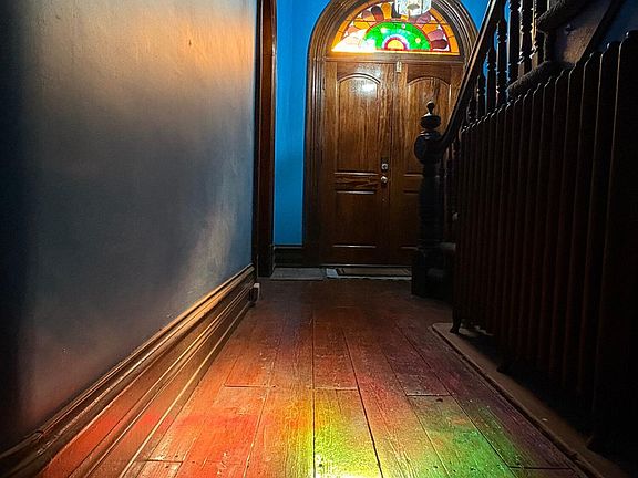 Inside, you're greeted by rich period details rarely found today—soaring ceilings, original hardwood floors that glisten with natural light, and ornate wood trim framing elegant archways. From the intricate woodwork to the historic radiators, every corner bursts with character and history.