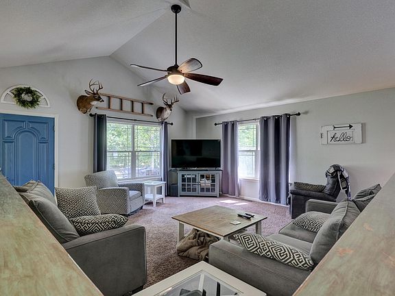 Absolute seclusion with city amenities, city water & septic. 6.3 acres wooded, home has open floor plan with cathedral ceilings in living room and master bedroom. Extremely large bedrooms. His and her closets, 2 full baths and 2- 1/2 baths. Full basement with storm room. Above ground pool stays. Nice mower shed and storage plus 1520 sq. ft. 38 x 40 3 door RV barn with 2 car detached shop with electric Piped for central Vac-never used.