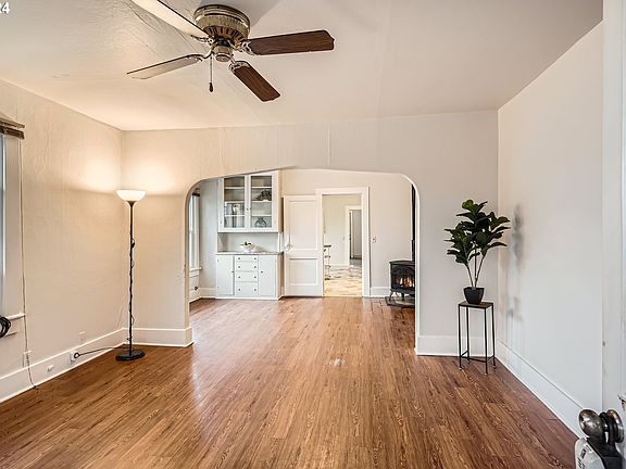 Charming starter home or investment property featuring a covered front porch. Easy-care vinyl floors flow through the living and dining areas, with a built-in dining cabinet and gas stove for cozy warmth. The kitchen offers ample cabinets and a large walk-in pantry, while the spacious laundry room opens to a back deck. Outside, a workshop provides extra storage. Recent upgrades include a newer roof, fresh interior paint, double-pane windows, and an ADA shower. The oversized 1-car garage, accessible from the back alley, includes an extra room and expansive attic storage. Conveniently located near downtown Molalla, schools, parks, and shops.