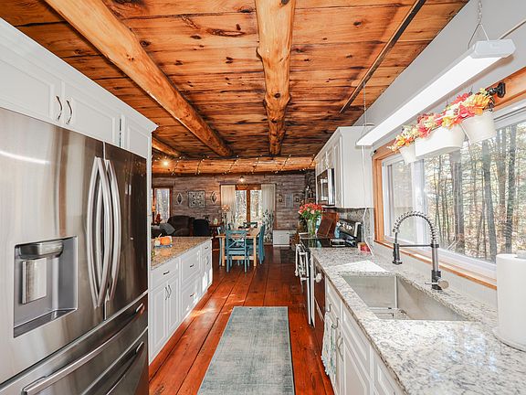Don't Miss the Open House on Saturday, 11/11 from 11-1pm! Welcome home to your cozy log cabin on almost 2 private wooded acres. Yet down the street is a grocery store, restaurants & SNHU all in a great commuter location. Drive up the driveway to the oversized 2 car att'd garage with direct access to your 8x10 covered porch area. Then enter the newly renovated kitchen & notice all new stainless steel appl's including a double oven & dual dishwasher. The added kitchen island with gleaming granite countertops adding additional storage space and extra island seating. The inviting dining/living room combination with vaulted ceilings, beams, a beautiful flr to ceiling stone fireplace & wide pine wood flooring thru-out. Sliders off the living room lead to an expansive 900+/- sqft TREX deck for entertaining fun overlooking a landscaped backyard with lovely garden space. You will also find the primary bdrm and 3/4 bathroom conveniently located the 1st flr. There are 2 bdrms w/vaulted ceilings & a full bathroom on the 2nd floor. Basement level has an oversized 10x12 walk-in cedar closet, a partially finished rec & work space room for possible living space. Newer roof, water heater & central A/C. Need a place for toys or tools, we have just the place for that in the newly constructed 8x12 shed. Don't miss out on this opportunity to own a truly unique property that will offer you rustic charm with modern comfort & privacy all in a convenient location. Realtor related to seller