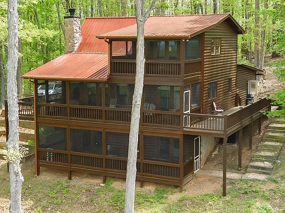 The views from this cabin are spectacular! Only 1.4 miles from Blue Ridge, This 3 bedroom/3 bath home is close to downtown Blue Ridge, but yet on the popular Aska road area. This is a small gated community with nice homes and great neighbors. Screened in wrap around porches on main level and lower level, plus a deck off of the master bedroom, hardwood floors throughout main level and upper level, tile floors in the bathrooms. 2 stone fireplaces with huge hearths - Wood burning fireplace on main level and gas fireplace on lower level. Stone counter bar in kitchen, This location is very convenient to everything, hiking trails on Aska, Toccoa River for fishing, tubing and kayaking, yet close to historic downtown Blue Ridge for shopping and restaurants