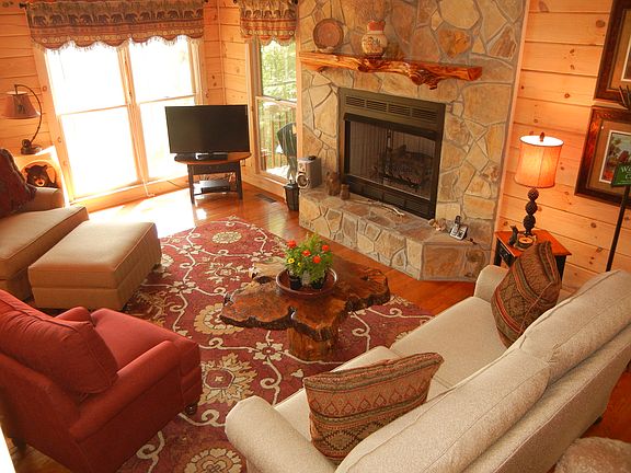 The long view layered Blue Mountains sit behind this cabin as you drive up...the wrap around porches ensure plenty of room for outdoor entertainment. There is even a screened in porch area that sits over the view. The interior of the home offers cathedral ceilings and lots of glass gazing over the majestic mountains. There is a bedroom and bath on each level. King size bed fits sweetly in the master. Roomy interior with charm. This cabin is perfect for a weekend rental or a retreat for you to escape the chaos of city life. This cabin sits perfectly in the Aska Adventure Area and is close to the river, hiking, camping, canoe rentals, tubing and fly fishing. Lake Blue Ridge is less than 15 minutes away. If your dream has been to have a cabin this one is the perfect size for you.