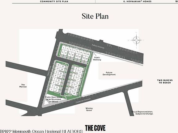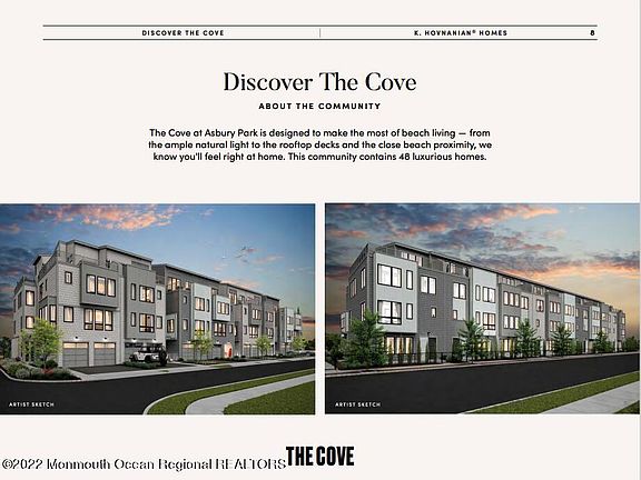 *New Construction* just completed. The Cove in Asbury Park. Expansive modern townhouse w/four floors of livng & storage space. This home is styled in the KHovnanian ''Loft Look''. Features incude 9' ceilings on each level, stunning desiger kitchen with plenty of counter space and Aristocraft cabinets. Open & airy great room & dining area. Spacious owner's suite w/walk-in closet & double sink vanity, private fourth floor bedroom plus loft space & roof deck for indoor/outdoor entertaining. Bathrooms located on all living floors. One car garage plus driveway for additional vehicle. High ceilings & open floor plan throughout, prewired outlets, tankless hot water heater. Beach, restaurants, shops, library, parks are just a short walk, bike or scooter ride away.