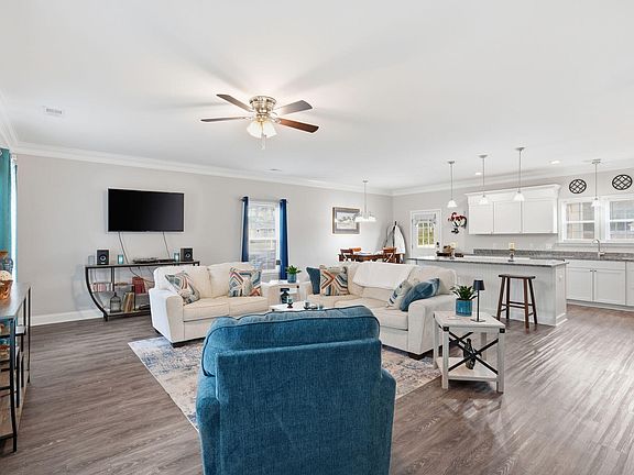 Meticulously-maintained newly built 3-bedroom, 2-bath home offers 1,500 square feet of single-level living with an open floor plan and functional layout. LVP flooring runs throughout, creating a bright and inviting space. Upgraded crown molding throughout.The kitchen features granite countertops, stainless steel appliances, a large island with pendant lighting, ample counter space, and a pantry, opening seamlessly to the living and dining areas. Both bathrooms include tile flooring and granite vanities. The primary suite offers a walk-in closet and an en-suite bath with a tiled walk-in shower, double sink vanity, and upgraded mirrors. Located on a 0.4-acre corner lot, the home includes a covered back patio with ceiling fan, retractable back-door screen, concrete pad, gutters andarchitectural shingles. A matching 10×12 elevated storage shed with ramp and hurricane tie-downs, , and keypad entry doors complete the package.