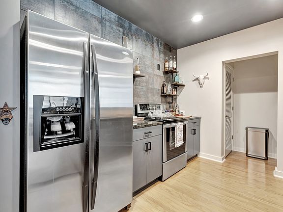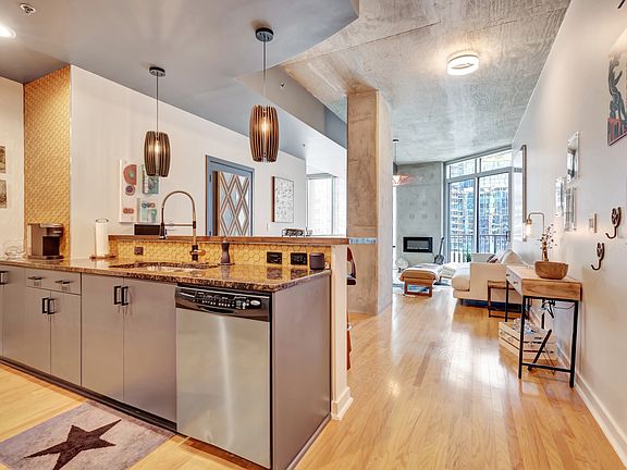Elegant 1 bedroom 1 bathroom fully renovated condo with downtown city views throughout. Upgraded kitchen features stainless steel appliances, new tile, painted cabinets, industrial open shelving, & butcher block bar top with seating. A coffee bar has been added to the storage nook. The cozy living room includes hardwood floors, an electric fireplace, & access to the balcony where you can relax for sunrise coffee & sunset happy hour. Wall between the bedroom & living room was replaced with a half-wall and live edge wood countertop which opens up the floor plan & allows natural light to travel through. Bedroom boasts a wall of windows & brick accent wall. This particular floor plan allows you to fall asleep and wake up to the gorgeous downtown views. Parking spot & storage unit included.