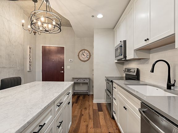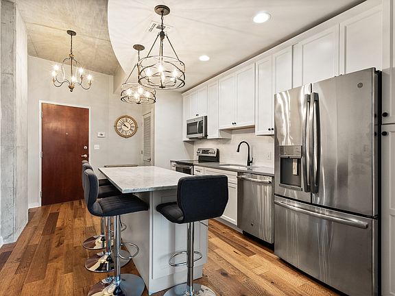 Stunning floor to ceiling renovation in Downtown's hottest full service high rise. Fully upgraded w/ white cabinetry, island addition w/ extra storage & marble counter top, double ovens, stainless steel appliances, new lighting & warm wood flooring throughout, shiplap wall detail, custom bathroom vanity, soaking tub w/ marble tile details & glass. The private balcony & walls of windows provide exceptional natural light & downtown views. Walkable to all the city has to offer!