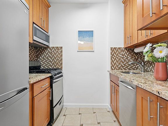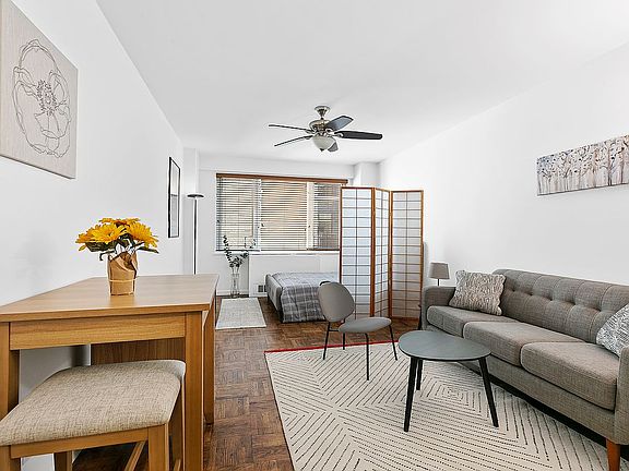 Why rent when you can own? Apartment 10B is the absolute perfect pied a terre or starter apartment. This move-in ready studio features a tastefully renovated kitchen with glass tile backsplash, granite counters, ceramic flooring and stainless appliances (including a dishwasher)! The renovated bathroom offers a bathtub with a glass enclosure, ceramic flooring and walls and an extended granite countertop. The large living space can easily accommodate a living, dining and sleeping area seamlessly. Enjoy your new home's Hunter Douglas ceiling fans, central air conditioning and heating, freshly painted walls and three closets for all of your storage needs.