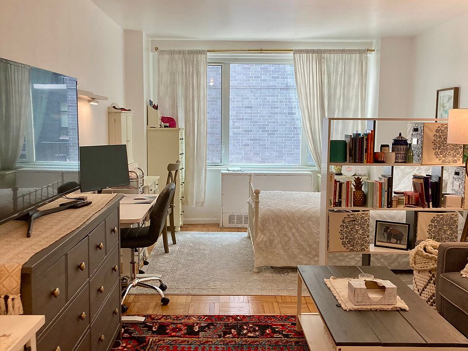 Spacious studio with new windows in full service co-op in Gramercy without the hassle of board package/approval! Plus, you will not find a sweeter owner/landlord. Quiet & cheerful home features plenty of room for sleeping, entertaining and working from home, with large windows that overlook patios below. Separate kitchen has many cabinets and full size appliances including microwave. Great storage provided by 2 closets near the tiled bathroom and one more at entry. Through-wall A/C = no window units needed! A rare sponsor unit (no board package/approval/fees) at the Gramercy East, a full service co-op with 24hr doorman/concierge, laundry, and wonderful planted roof deck with 360-degree views of Manhattan and beyond. Easy access to trains, Gramercy Park, Madison Square Park and all that Gramercy living has to offer. Tenant occupied; please allow 24hrs for showings. Please note the following: * Application fee: $20/applicant * First month rent and Security deposit (equivalent to 1 month rent) due at lease signing * Co-op move-in/out building security fee (non-refundable): $300 Mon-Fri, or $600 Sat * Co-op move-in/out damage deposit (refundable): $500