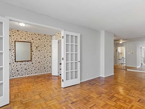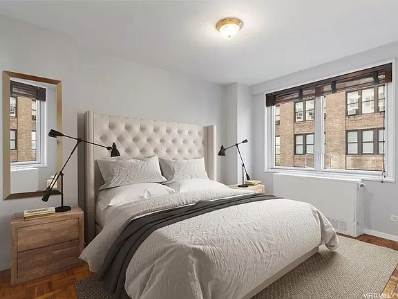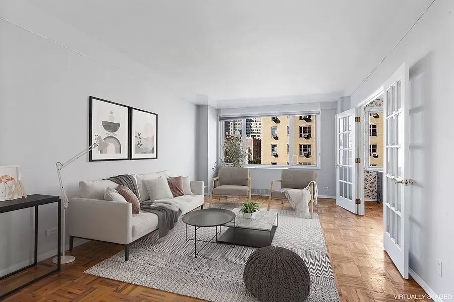 Beautiful light and views from this generously sized 2 bedroom, 1.5 bath home at the Gramercy East located at 2nd Avenue and 22nd Street. A nice size foyer opens up to the large living room with east facing windows offering views of midtown including the Empire State building (see picture). There is large walk thru kitchen and a formal dining room with another western exposure, closet and french doors that allow it to easily be used as a great home office or even a 3rd bedroom. The kitchen has a new dishwasher lots of cabinets and full size refrigerator. A half bath/powder room is off the foyer. A hallway leads to the guest bedroom, corner and primary bedroom with 2 exposures and full bath with a window. The guest room faces south over 22nd Street and has a large closet. The primary bedroom easily fits a king bed has a double exposure south and west and large closet. The apartment gets wonderful light throughout the day and has abundant closet space. Original hardwood parquet floors are in very good condition. 301 East 22nd Street is a full service building with a 24 hour Doorman, live in Superintendent, central laundry room, garage, bike and general storage(when available) and lovely planted rooftop deck with panoramic views. The Gramercy East was built in 1966 and has about 260 apartments. The building has just installed new windows and is pet friendly, allows pied-a-terres and limited subletting. 80% financing allowed. Please note photos are virtually staged.